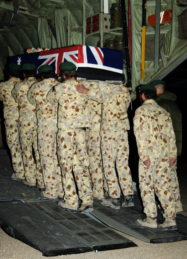 - With the casket of Private Gregory Sher, now entrusted to them, Australian air crew, prepare to take fallen soldier home to Australia.