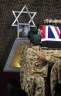 - Private Gregory Sher’s casket, rests beneath his portrait and the symbol of his Jewish faith, during his ceremony, at Tarin Kowt, southern Afghanistan
