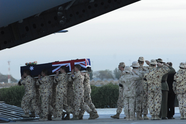 - Standing at attention, the bearer party moves through the honour guard towards a C-17 destined for Australia.