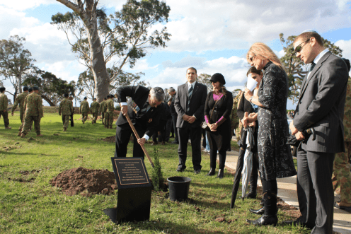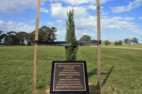 Plaque: These trees were planted on 21/03/2009 and donated by 1st Commando Regiment Australian Defence Force and the Jewish National Fund to honour the memory of Pvt Gregory Michael Sher KIA 04/01/2009 (Afghanistan)